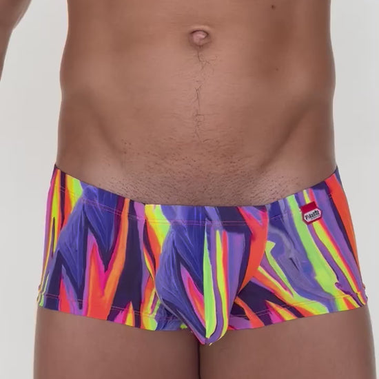 Pikante Abstract Trunk 1828 This men’s low-rise trunk bursts with vibrant color and bold style through its dynamic abstract pattern. Crafted for individuals who want to make a statement, it features a soft, stretchy microfiber fabric that fits snugly and comfortably. The contoured front pouch offers enhanced definition, and the short square-cut legs provide a sleek, athletic look.